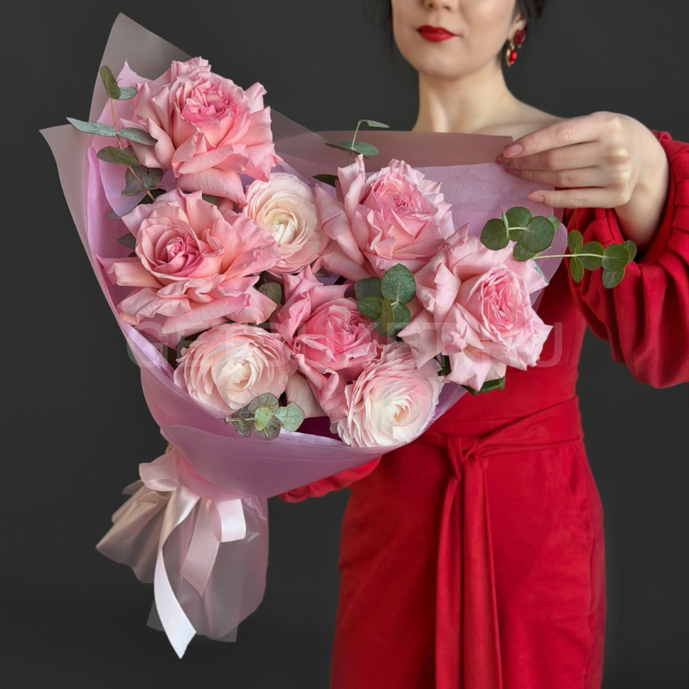 Букет из роз с ранункулюсом и эвкалиптом