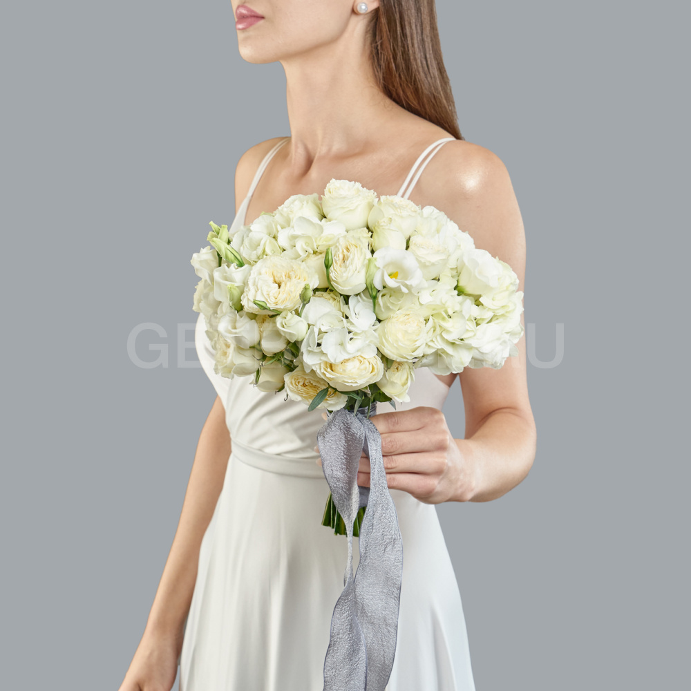 Букет невесты из белых кустовых роз и эустомы с гортензией