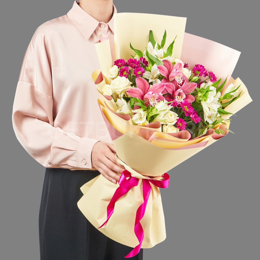 Букет из нежных альстромерий, кустовых роз и орхидеи