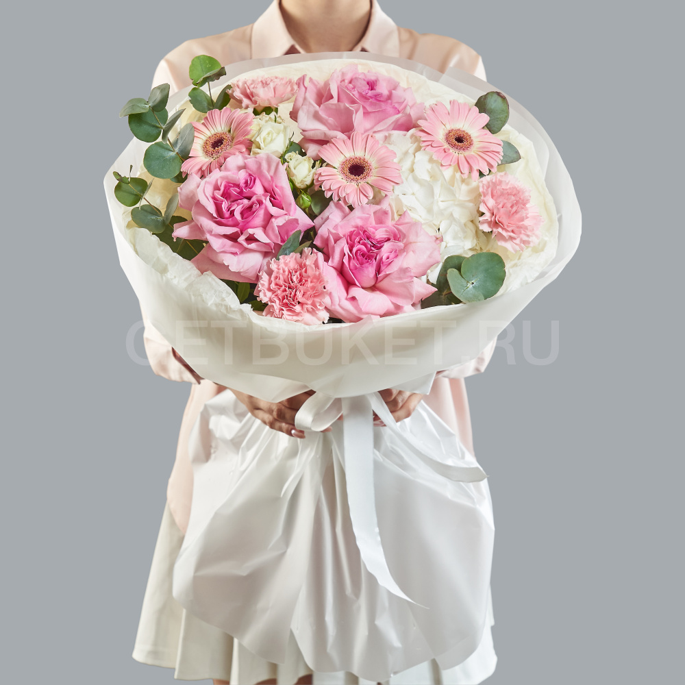 Букет из роз, гвоздик и розовой гортензии с эустомой18 070 ₽Букет из роз, гвоздик и розовой гортензии с эустомой 18 070 ₽ -