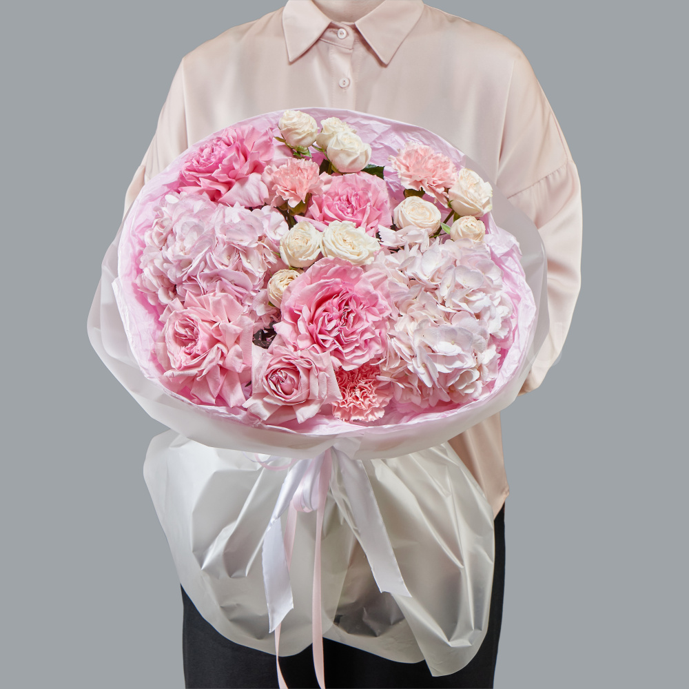 Букет из роз, гвоздик и розовой гортензии с эустомой18 070 ₽Букет из роз, гвоздик и розовой гортензии с эустомой 18 070 ₽ -