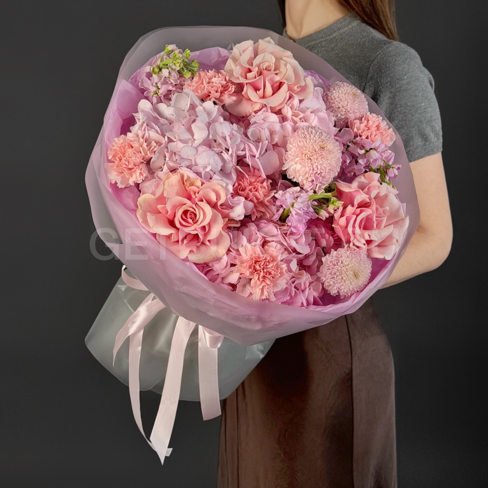 Букет из роз, гвоздик и розовой гортензии с эустомой18 070 ₽Букет из роз, гвоздик и розовой гортензии с эустомой 18 070 ₽ -