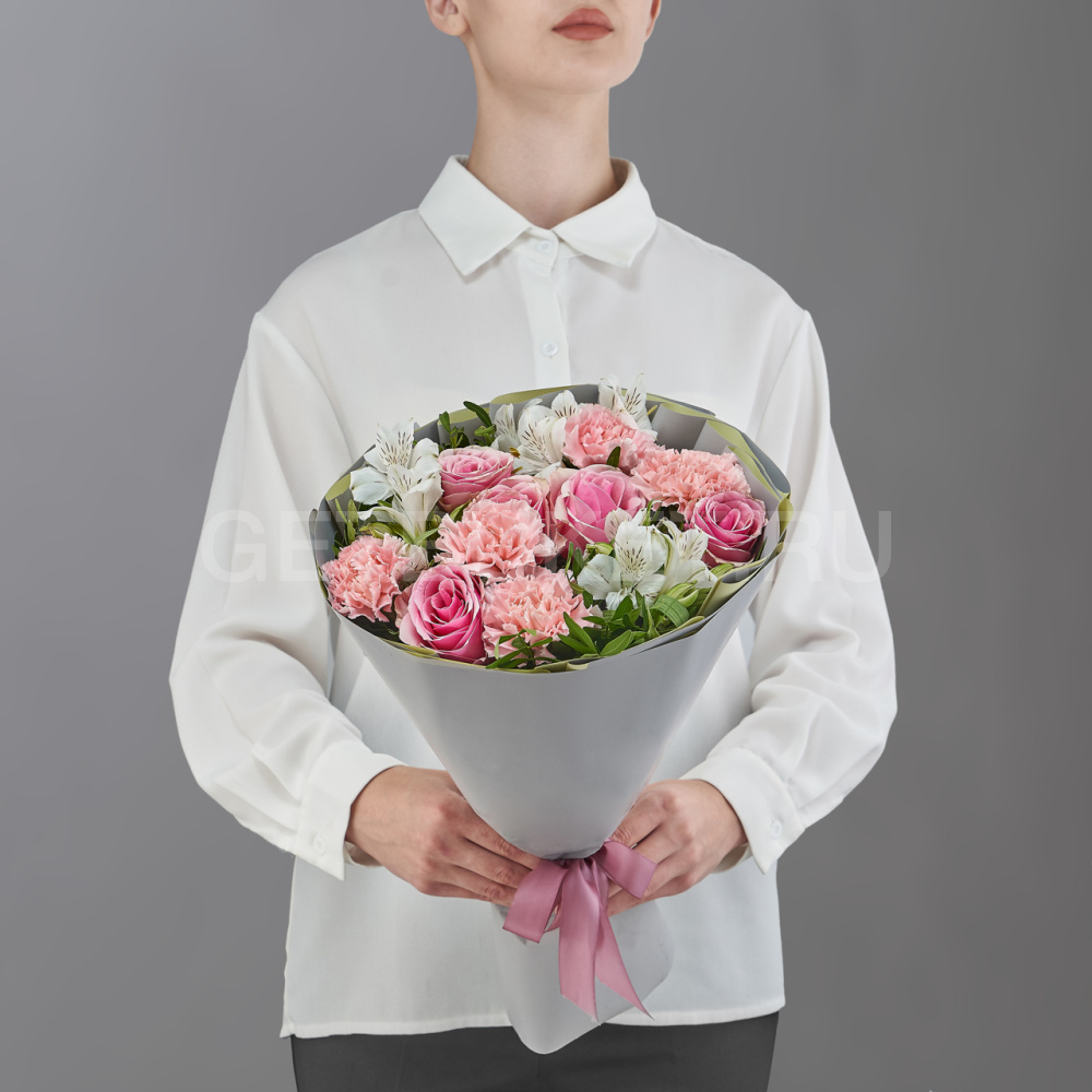 Букет из розовых гвоздик, роз и альстромерий3 523 ₽Букет из розовых гвоздик, роз и альстромерий 3 523 ₽