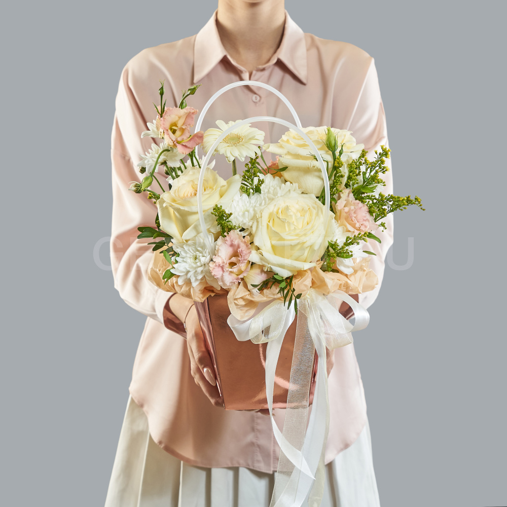 Цветочная композиция с розами, хризантемой и танацетумом в сумочке3 874 ₽Цветочная композиция с розами, хризантемой и танацетумом в сумочке 3 874 ₽ -