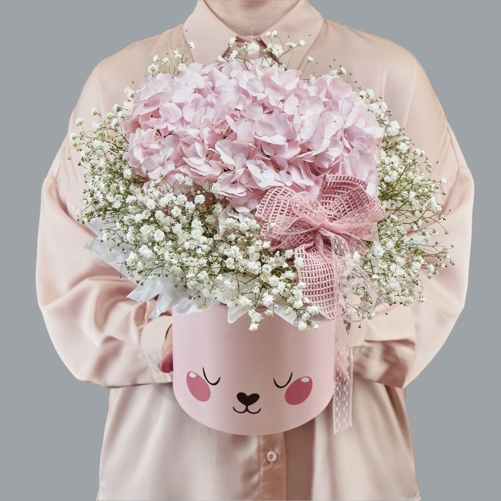 Детская композиция из гортензии и гипсофилы в шляпной коробке