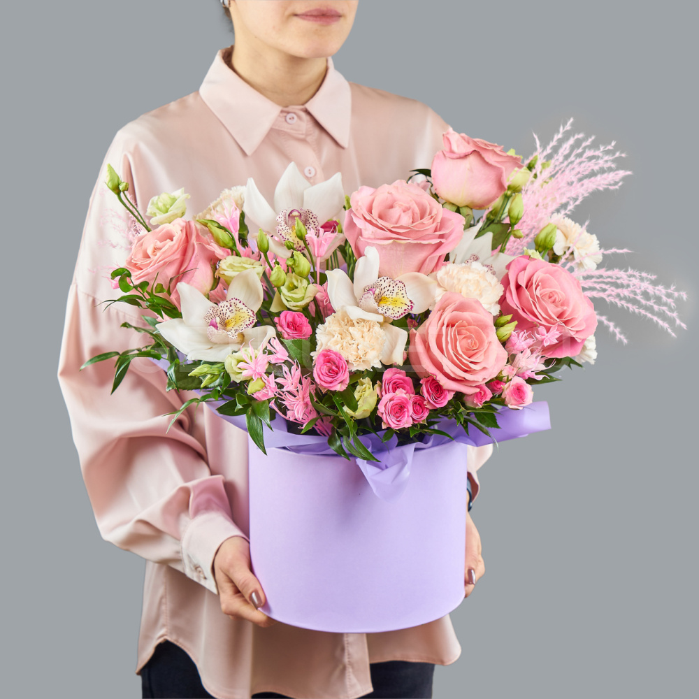 Цветочная композиция из розовых роз, орхидеи и эустомы в шляпной коробке