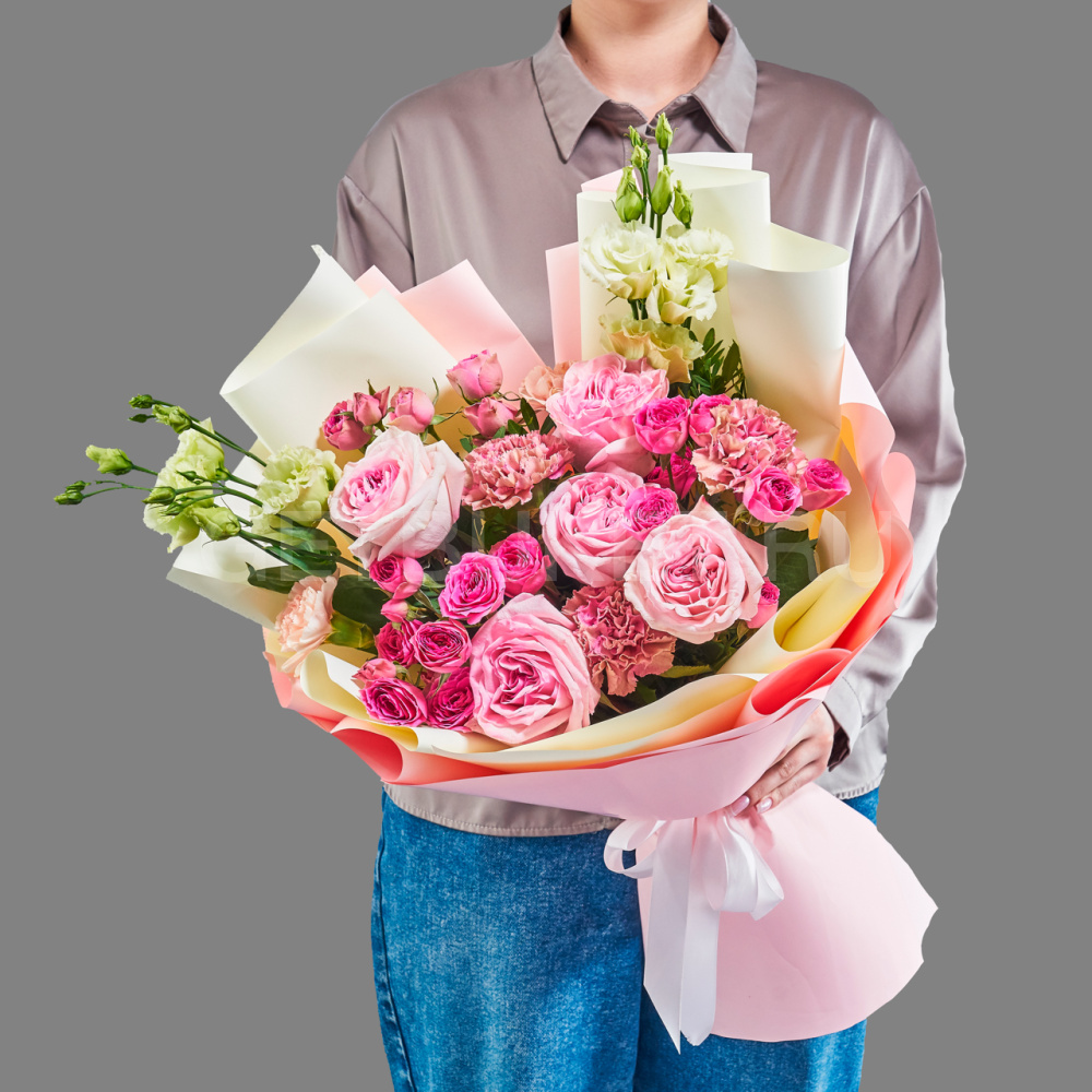 Букет из розовых роз, гвоздик с эустомой